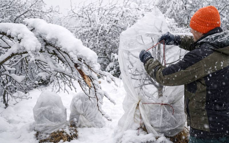 При неблагоприятных прогнозах плотно обвязывайте кроны эластичным шпагатом или сеткой, сближая ветви у ствола для снижения парусности под снегом. Укрепляйте опорами тяжёлые горизонтальные сучья, особенно у елей и яблонь, учитывая ожидаемые 30-50 см снега. Формируйте крону осенью, удаляя слабые перекрёстные ветви для равномерного распределения нагрузки.