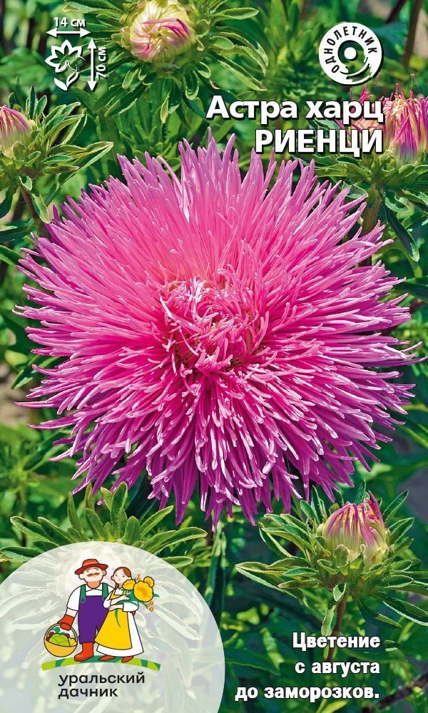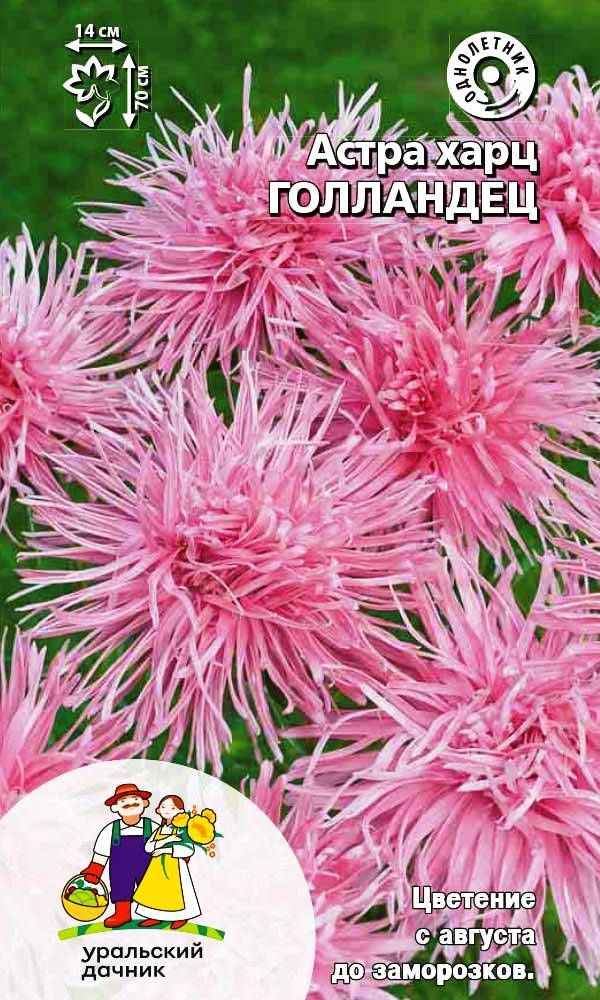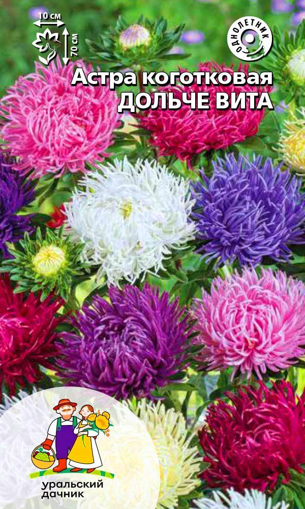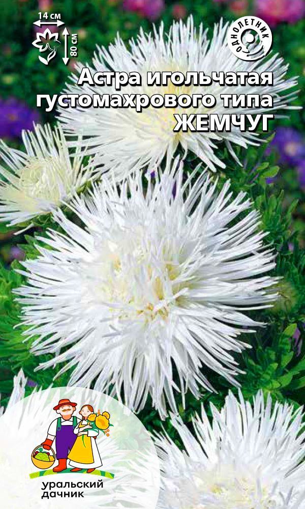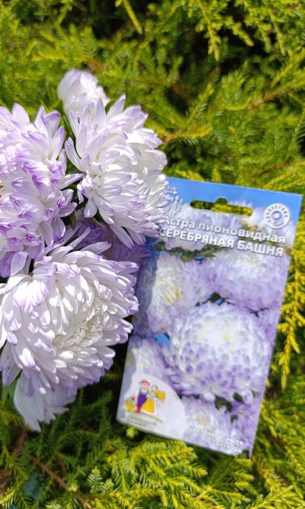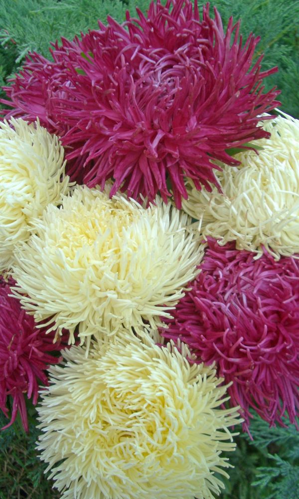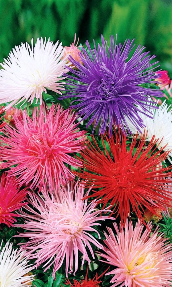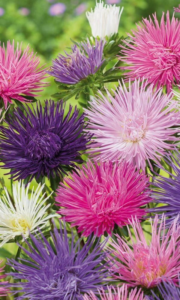 Густомахровая игольчатая астра! Растения высотой около 60 см. Соцветия густые длинноиголчатые, белые, кремово-жёлтые, серебристо-голубые, фиолетовые, серебристо-розовые, красные. Цветёт в августе - сентябре. Используют очень широко: для посадки в сборные цветники...
