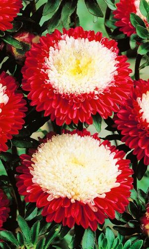 ОднолетнееПрекрасная двухцветная астра с помпонными соцветиями Ø7-9 см. Кусты компактные, колонновидные, прочные, высотой 50-60 см, за период вегетации формируют 25-30 соцветий на длинных цветоносах. Цветение раннее и продолжительное, с июля до глубокой осени. Астры холодостойкие, светолюбивые (но выносят полутень), не любят сырых, переувлажненных почв. Широко используются для оформления клумб, бордюров и цветников. Отлично подходят для срезки, цветы стоят в воде до двух недель.