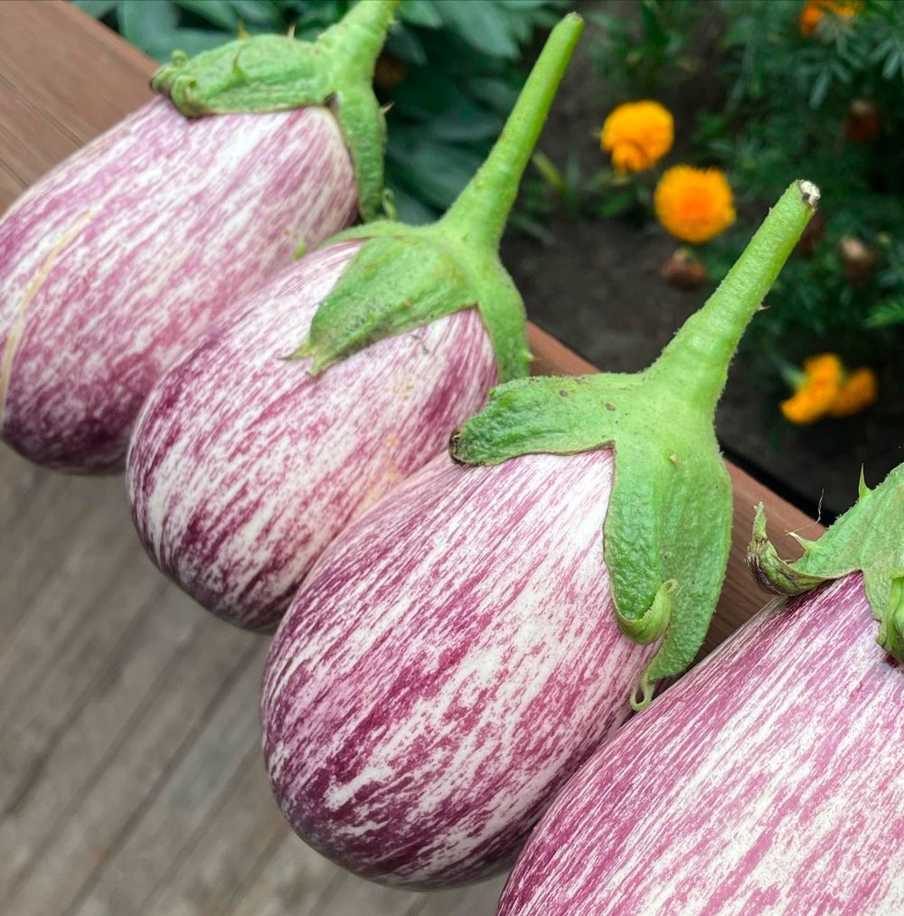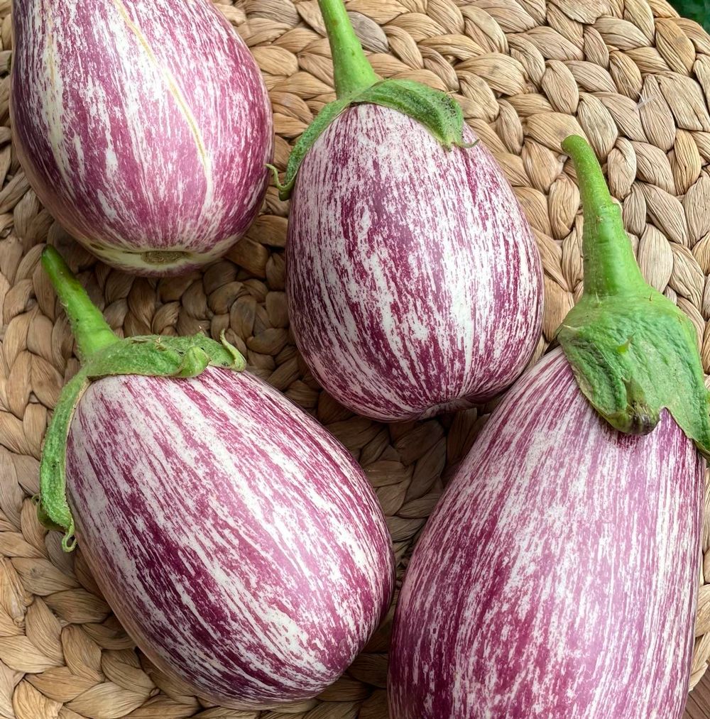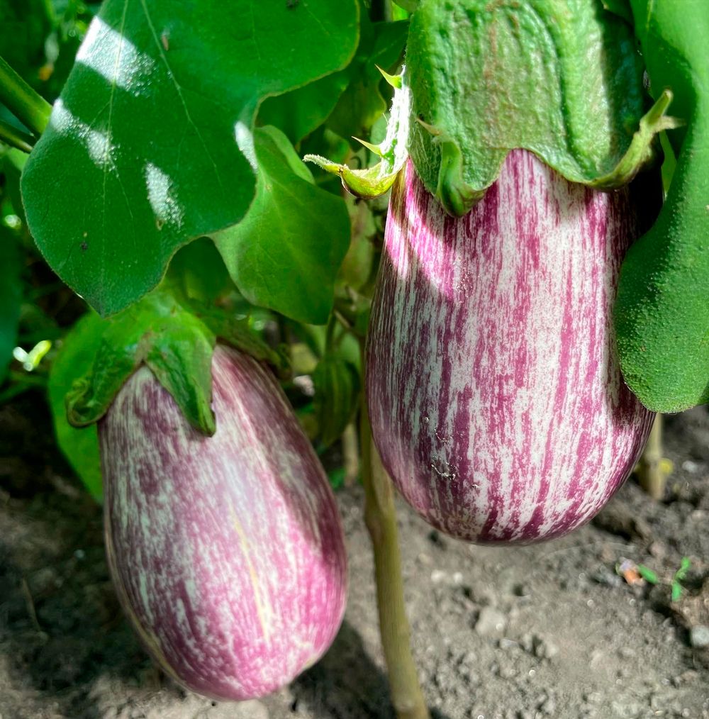Среднеспелый сорт для открытого грунта и плёночных укрытий. Растение полураскидистое, высотой 63-75 см. Плоды овально-грушевидной формы, полосатые, с чередованием белых и ярко-выраженных розово-фиолетово-сиреневых полос, массой 250-400 г. Мякоть белоснежная, без горечи.