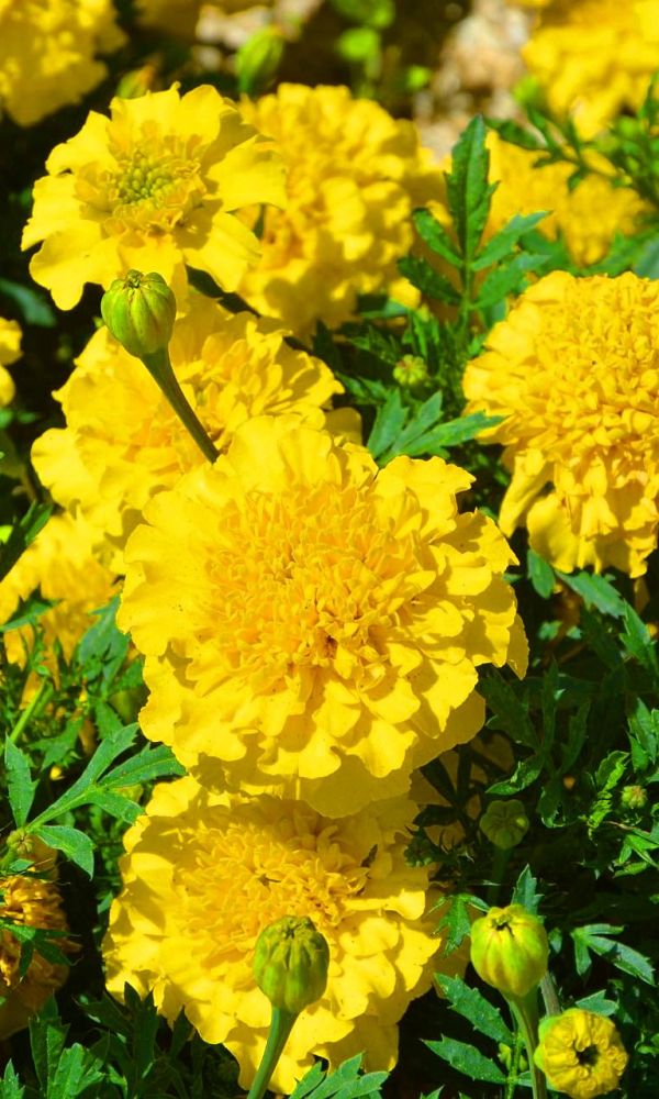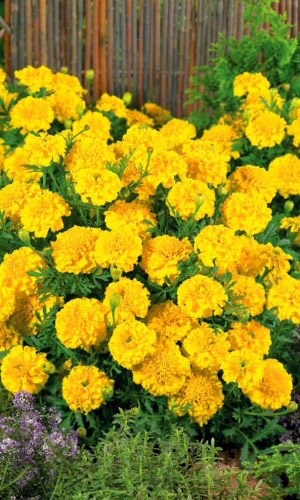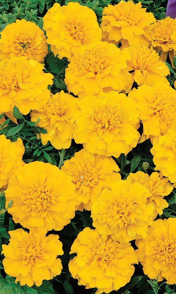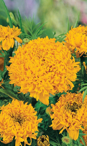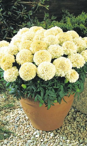 Роскошные, мощные кусты с многочисленными, густомахровыми соцветиями нежного, золотисто-жёлтого цвета, хризантемовидной формы. Бархатцы гармонично выглядят в любых цветниках, прекрасно держат форму (не разваливаются от дождя и ветра), переносят понижение температуры...