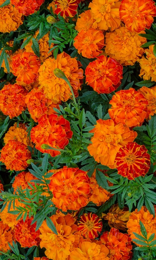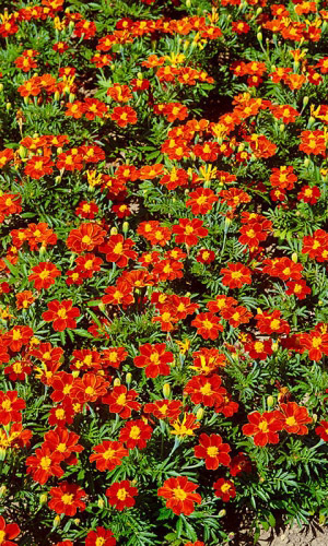 Бархатные соцветия изумительной красоты. Куст компактный, густо-облиственный, в период цветения весь покрывается яркими, двуцветными, оранжево-красными, с золотистыми краями цветками, собранными в махровые соцветия. Используют для клумб, рабаток, бордюров и украшения...