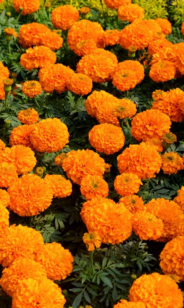 Обильное и продолжительное цветение. Растение высотой до 90 см. Цветки собраны в крупные, махровые и шарообразные соцветия - корзинки, диаметром до 10 см, жёлтой и оранжевой окраски. Цветет с июня до заморозков. Чтобы продлить цветение, необходимо удалять увядшие цветки...