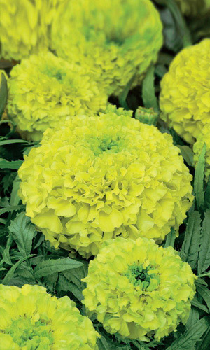 Великолепные крупные махровые соцветия. Куст компактный, высотой до 90 см. Побеги прочные, ребристые, светло-зелёные. Соцветия гвоздиковидные, полушаровидные, до 10 см в диаметре, лимонно-жёлтые. Используют для клумб, рабаток, высоких групп, на срезку. Цветёт с мая по сентябрь. ...