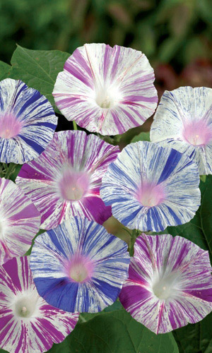 Необычная пёстрая окраска. Стебли достигают 2,5 м длины. Цветки крупные бело-голубые и бело-розовые, воронковидной формы диаметром 10-12 см. Цветёт обильно с июля по октябрь. Широко используются для вертикального оформления цветников различного назначения. Ботанический вид: Ipomoea purpurea...