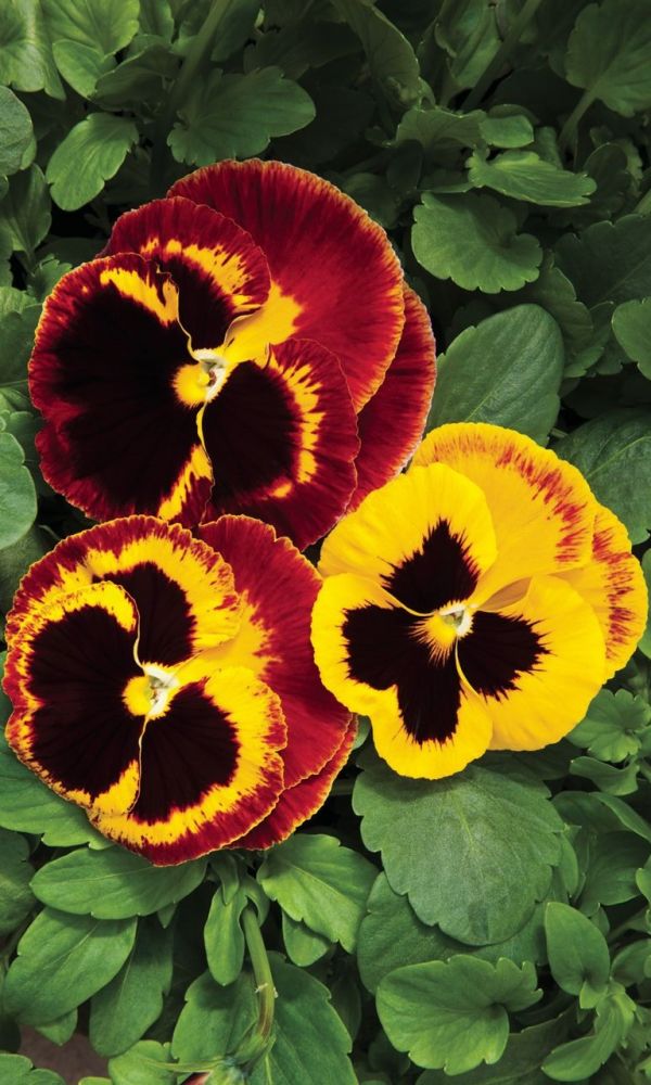 Растение с быстрым ростом, красиво и обильно облиственное, с исполинскими цветками, сидящими на короткой и твердой цветоножке, высотой 15 см. Зимостойкое. Цветы крупные трехцветные. Верхние лепестки красно-бардовые, нижние желтые с черными пятнами у основания лепестков...