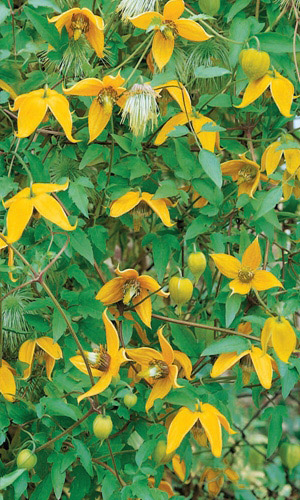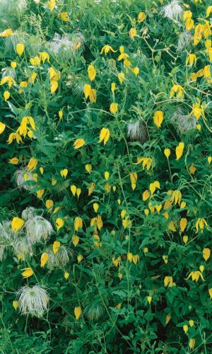 Один из самых декоративных дикорастущих клематисов. Красивая древесная лиана, достигающая 4 м в длину. Цветки ярко-жёлтые, поникающие, до 6 см в диаметре, в форме фонариков. Соплодия напоминают огромных серебристых пауков, благодаря которым клематис декоративен до...