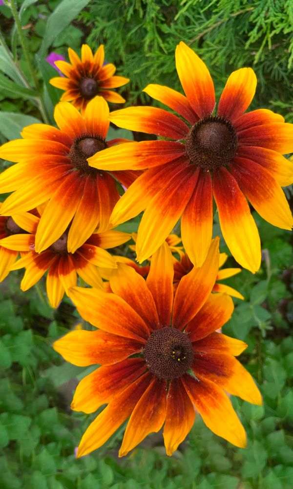 Длительное цветение в конце лета и осенью. Растение с прямостоячими стеблями, покрытое тёмно-зелёными лопастными литьями. Высота до 75 см. Соцветия корзинки крупные, тёмно-бронзово-жёлтые. Центр соцветия выпуклый, тёмно-коричневый...