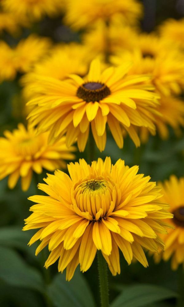 Длительное цветение в конце лета и осенью. Растение с прямостоячими стеблями, покрытое тёмно-зелёными лопастными литьями. Высота до 75 см. Соцветия корзинки крупные, тёмно-бронзово-жёлтые. Центр соцветия выпуклый, тёмно-коричневый...