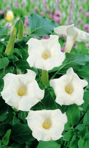 Растение олицетворяет достоинство и уверенность. Цветение датуры будет всегда в центре внимания. Громадные, очень эффектные белые, длиной до 20 см, трубчатые цветы, горят среди крупных, пушистых листьев. Цветение обильное и продолжительное.Ваш сад в вечернее время...