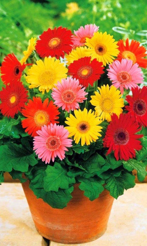 Великолепное комнатное растение. Куст компактный, высотой до 50 см. Крупные соцветия – корзинки изумительной окраски с жёлтыми, оранжевыми, красными, розовыми и белыми краевыми цветками вокруг жёлтой серединки. Цветет осенью, сокращение светлого времени суток служит...