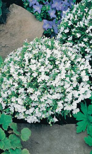 Растения образуют пышный каскад поникающих побегов длиной до 30 см, усыпанных множеством изящных цветочков. Цветение обильное и длительное - с июня до заморозков. В садовых цветниках каскадная лобелия приобретает стелющуюся форму. Используется в бордюрах и для подбивки высокорослых летников. Наиболее выигрышно смесь смотрится при выращивании в высоких контейнерах, балконных и подоконных ящиках, в висячих корзинах...