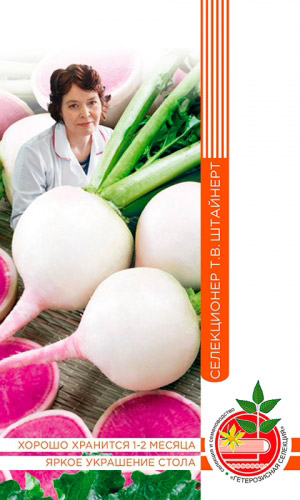 Истинное украшение любого стола! Корнеплоды выровненные, круглые, белого цвета, диаметром 10 см. Мякоть розовая, очень нежная, сочная, без горечи. Отлично хранится. Холодостойкий...