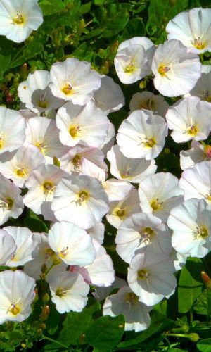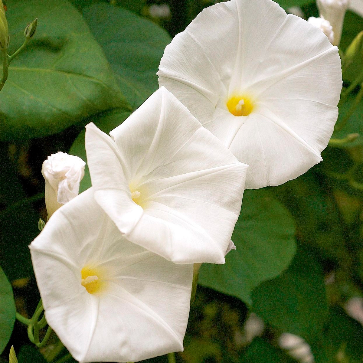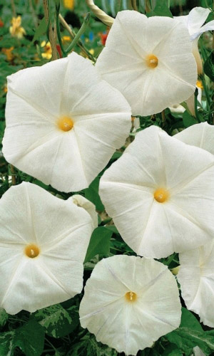 Восхитительные белоснежные граммофоны цветов. Одна из самых красивых садовых лиан, высотой около 250 см. Листья сердцевидные, на длинных черешках. Цветки воронковидной формы, крупные. Цветёт обильно с июля по октябрь. Используют для вертикального оформления цветников...