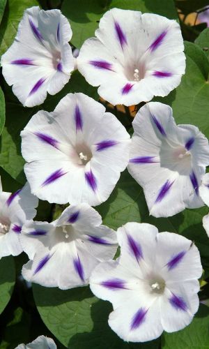 Одна из самых красивых садовых лиан. Стебли достигают 3 м длины. Цветки воронковидной формы, крупные, белые, с лилово-синими стрелками. Цветёт обильно, с июня по октябрь. Прекрасно подойдет для создания плотной теневой завесы в летнее время, для быстрого прикрытия...