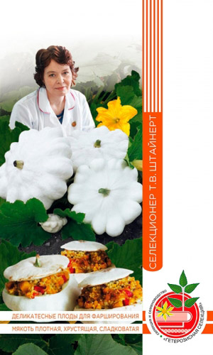 Среднеспелый (55-60 дней), кустовой сорт универсального использования. Плоды дисковидные с желобками, зелёные, массой 0,4-1,3 кг. Мякоть белая, плотная, оригинального вкуса, толщиной 2,5-3 см. Урожайность 2,1-2,5 кг/м2. Ценность сорта: холодостойкость, быстрое созревание плодов, отличные вкусовые качества, хорошая транспортабельность...