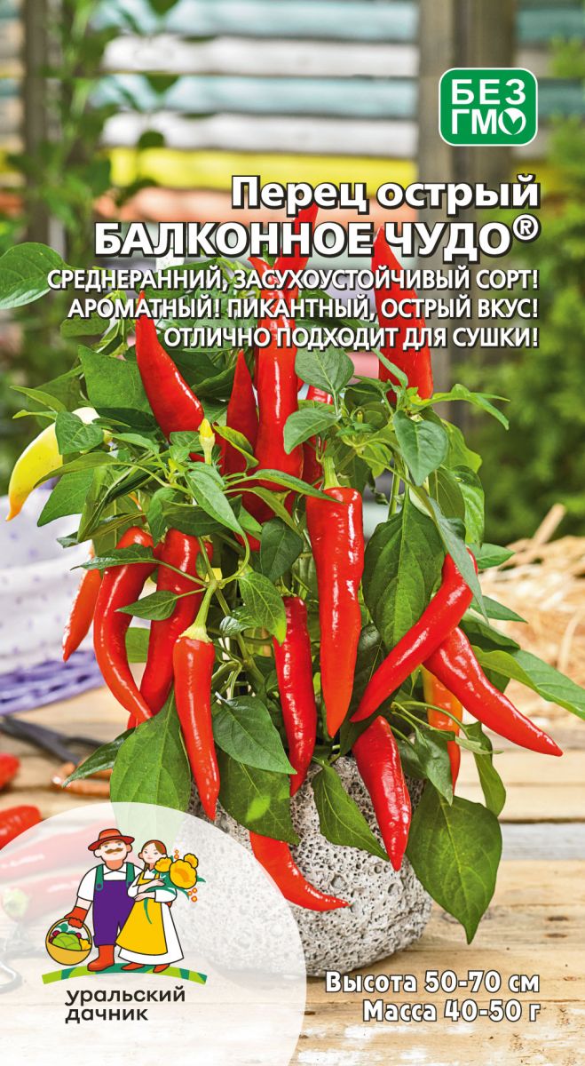 КомнатноеСреднеранний (от всходов до технической спелости 100-110 дней), засухоустойчивый сорт. Для выращивания в открытом грунте, под плёночными укрытиями, а также как балконная культура. Растения высотой 50-70 см. Плоды длиной 10-12 см и массой 40-50 г. Вкус острый, пикантный. Аромат сильный. Используется в консервировании, салатах, в качестве приправы и специй. Отлично подходит для сушки. Урожайность – 2,5-3,5 кг/м2.