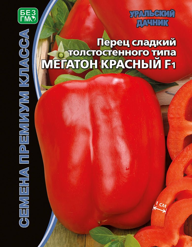 Гибрид раннего срока созревания. Для выращивания в теплицах, парниках, туннелях. Растение высокорослое (80-85 см), мощное. Плоды гибрида Мегатон F1 сразу выделяется на общем фоне, плоды его величественно висят по периметру куста крупными ровными тяжёлыми крупными кубами, гладкие, глянцевые. Плоды одни из самых крупных среди цветных перцев, вес их колеблется от 260 до 300 г (!), толщина стенки от 0,8 до 1 см(!), мякоть брызжуще-сочная, необыкновенно вкусная и ароматная. В собранном Вами урожае плоды перца будут "равны как на подбор" – один к одному крупные, толстостенные, вкусные и полезные.