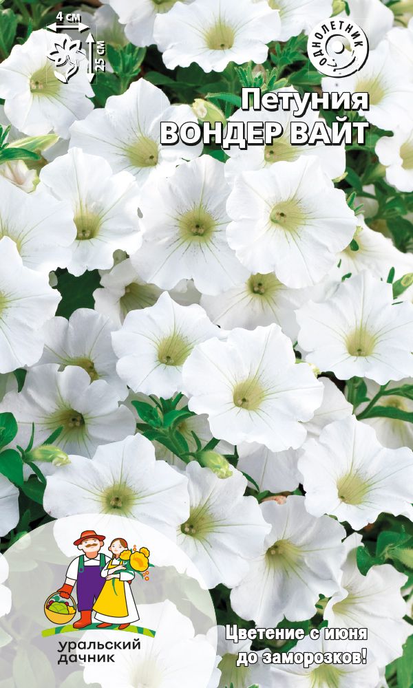 Модное сочетание белых соцветий и нежно-зелёной листвы. Красивые крупные чисто-белые цветы украшают плотный кустик высотой около 25 см. Обильно цветёт с июля по сентябрь. Используют в клумбах для ярких групп, на бордюрах, рабатках, в подвесных корзинках.Посев на рассаду в...