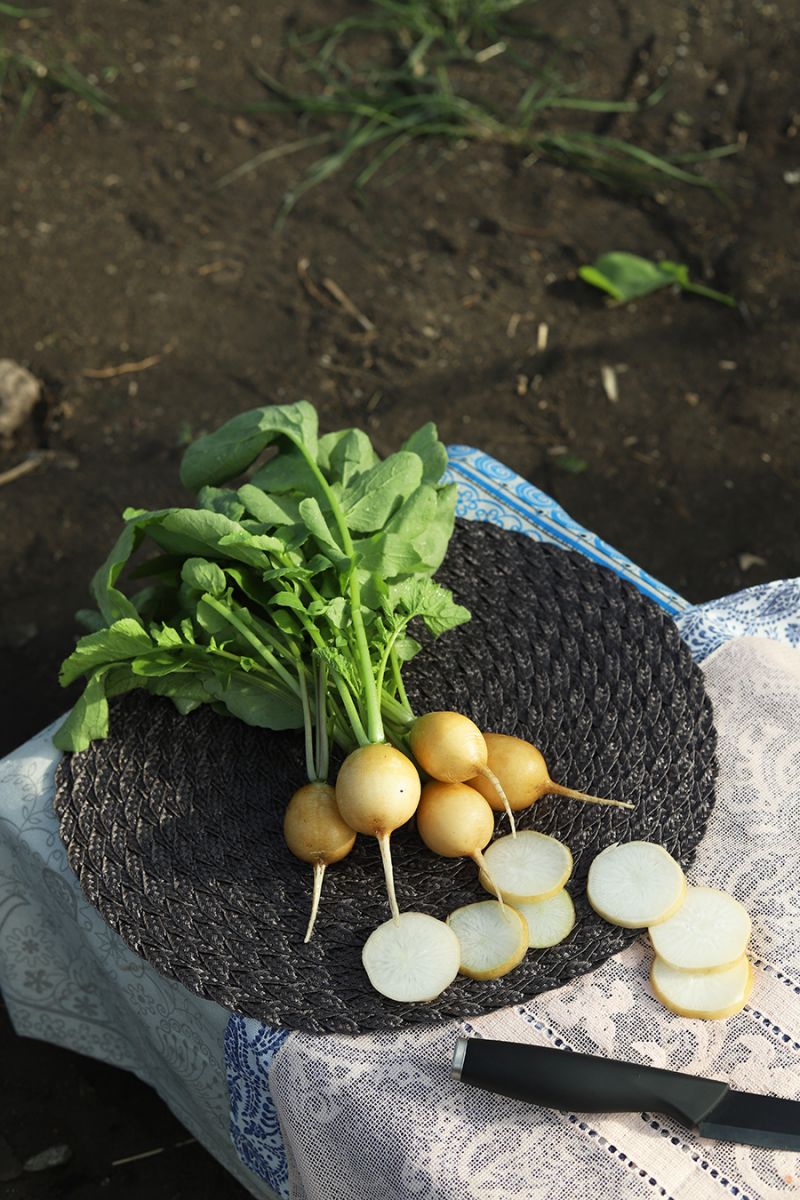 У корнеплода (кстати, растёт он полностью погруженным в почву), как уже отмечалось, необычный жёлтый цвет и исключительно правильная круглая форма, будто кто-то циркулем отчертил окружность. Ничего не напоминает? Да это же весёлый смайлик, заряжающий невероятным позитивом! Средний диаметр корнеплодов 6-6,5 см, вес – 28-30 г, они обладают очень хорошей товарностью. И, безусловно, этот самый первый огородный овощ необычайно вкусен: белоснежная мякоть – сладковатая, как шёлк нежная, сочная, обрамлённая золотой корочкой… Как же превосходен этот «смайлик» в свежей нарезке и салате! Это точно Золотое чудо!