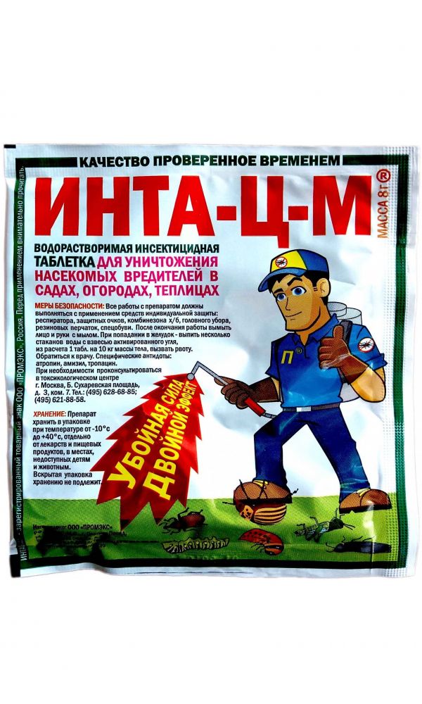 Инсектицид Инта-Ц-М – комплексный препарат на основе циперметрина и малатиона, обеспечивающий надёжную защиту растений от обширного списка огородных вредителей. Средство выпускается в форме брикетированной таблетки массой 8 г в вакуумном пакете с инструкцией по...