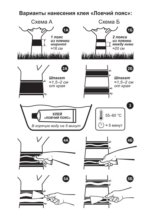 Перед нанесением клея для лёгкого и полного извлечения клея из тубы, а также лёгкого и равномерного его распределения, тубу с закрытым колпачком поместить в горячую воду (температура 55–60 °С) примерно на 5 минут. Вредители (цветоеды, долгоносики, гусеницы разных видов, муравьи, переносящие на деревья тлю) поднимаются от земли по стволу вверх и прилипают. Таким образом, листва, цветки и крона деревьев будут защищены. Прилипших вредителей убирают с ловчего пояса по мере накопления, клеевое кольцо обновляют.