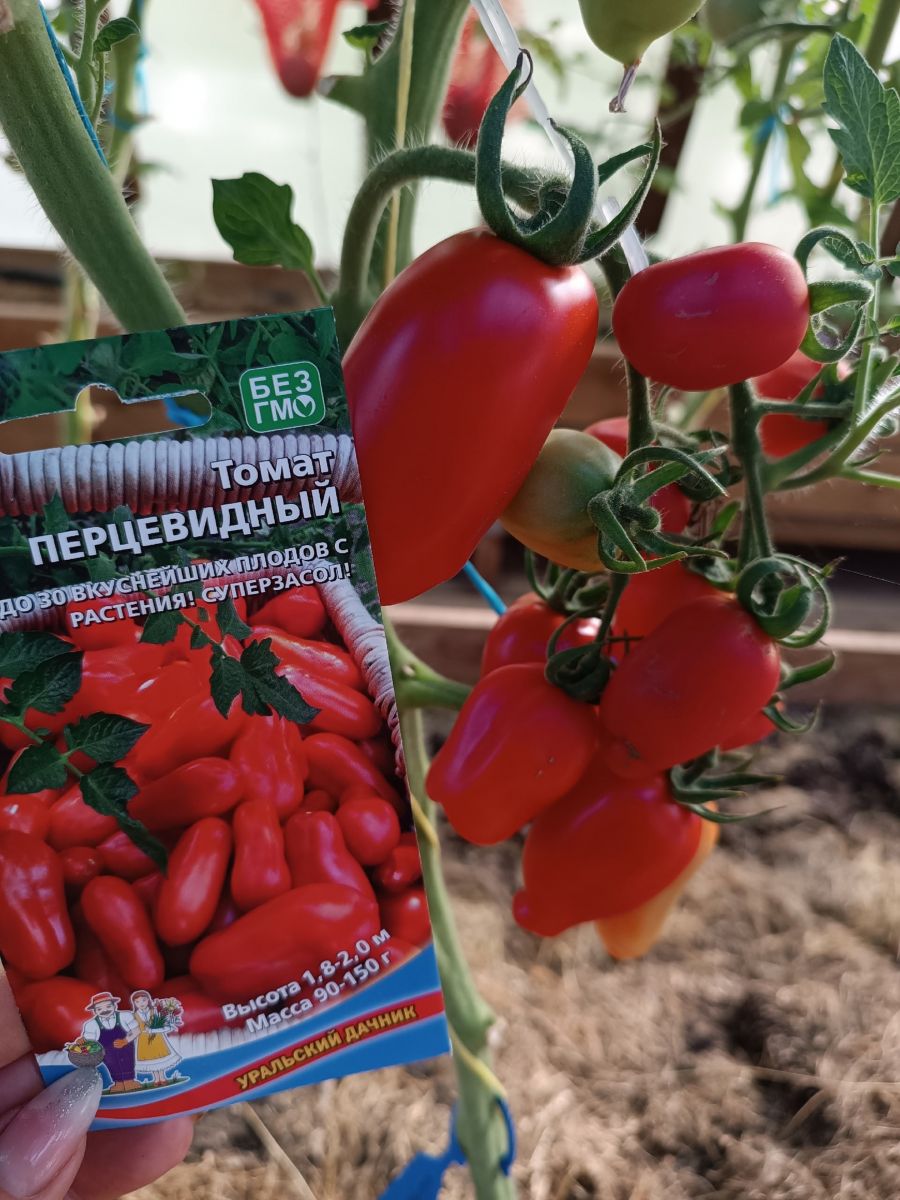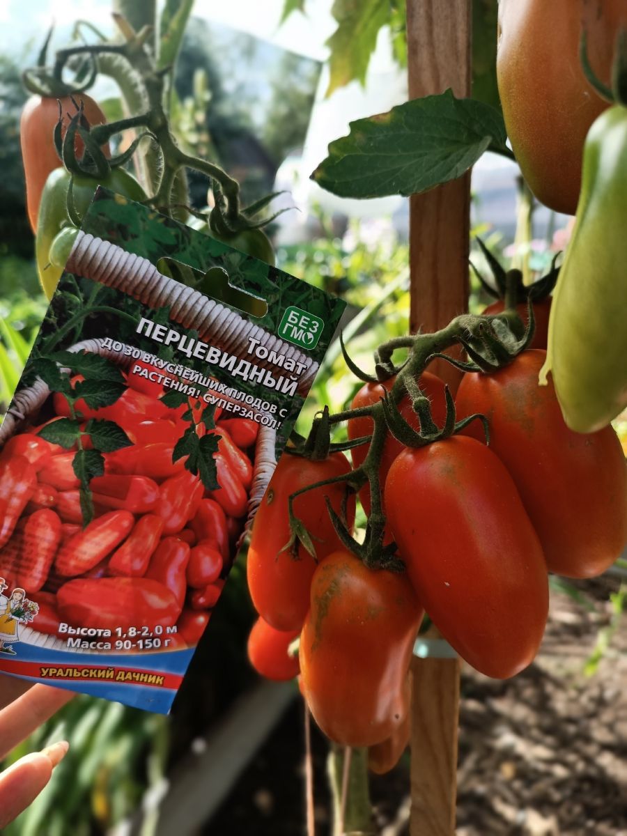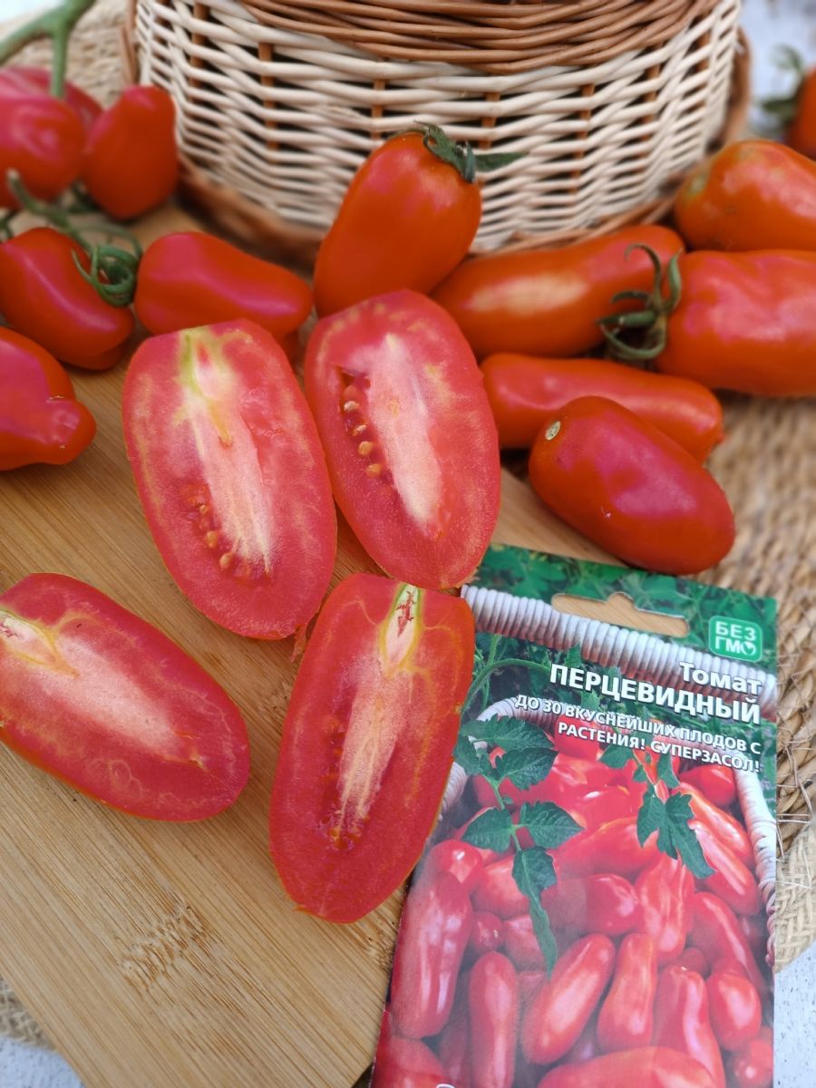 Томат Перцевидный – среднеспелый сорт. Плоды сладкие, мясистые, перцевидной формы, цвет – красный. Плоды содержат мало жидкости и семян. Вкусовые качества томатов отличные, плоды используются для приготовления свежих салатов, засола и консервирования, пригодны для фарширования.