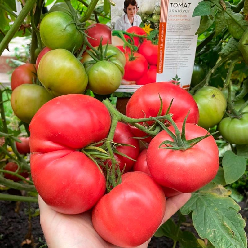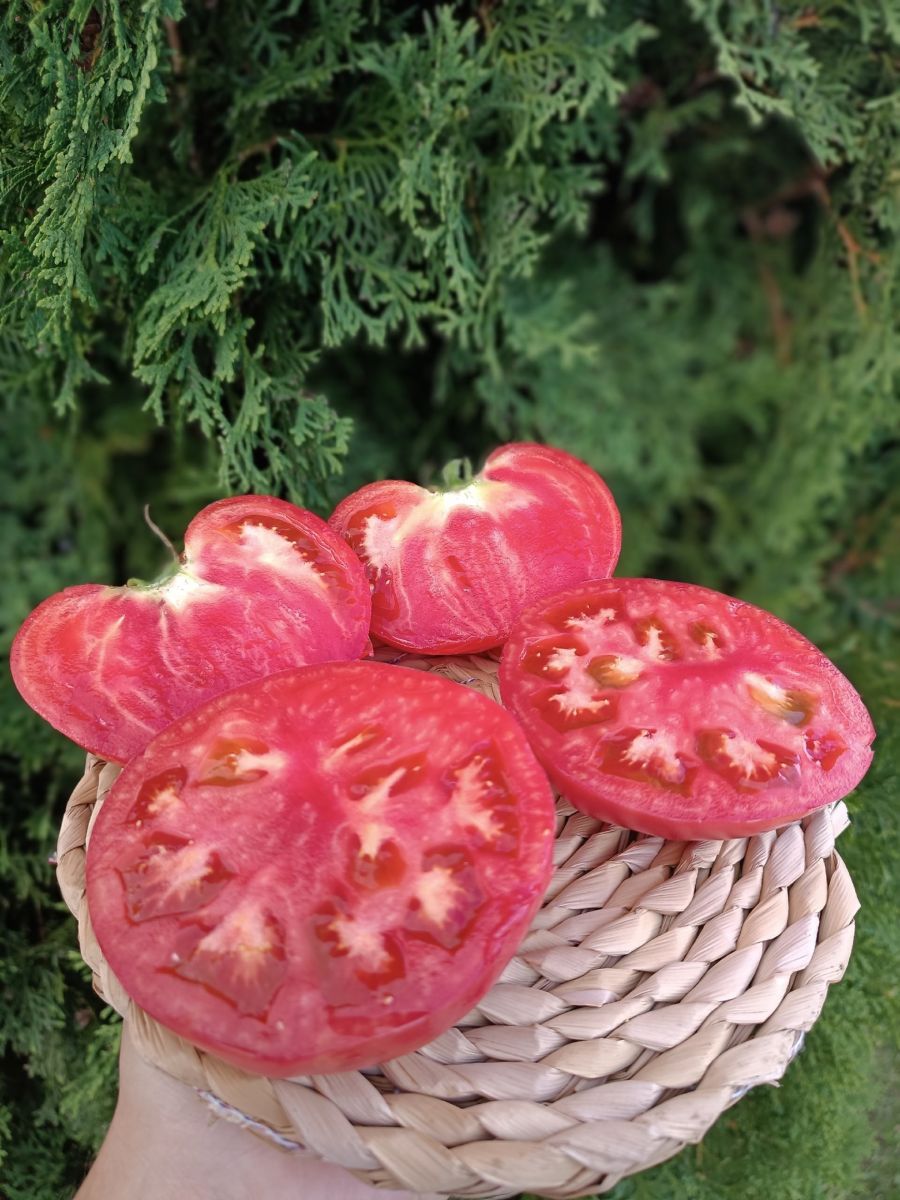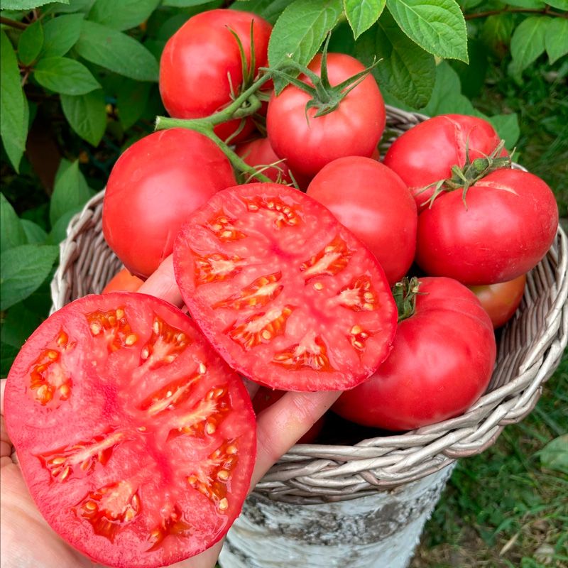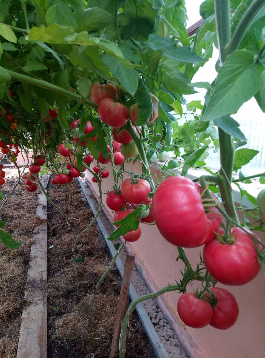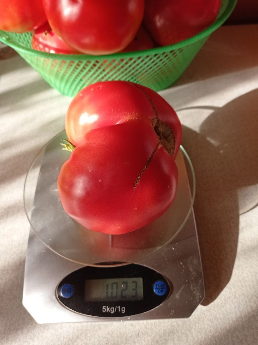 Первое соцветие закладывается над 6-7 листом. Плоды сердцевидной формы розовой окраски достигают массы в целый килограмм, при высоте куста меньше метра. Можно выращивать без пасынкования.